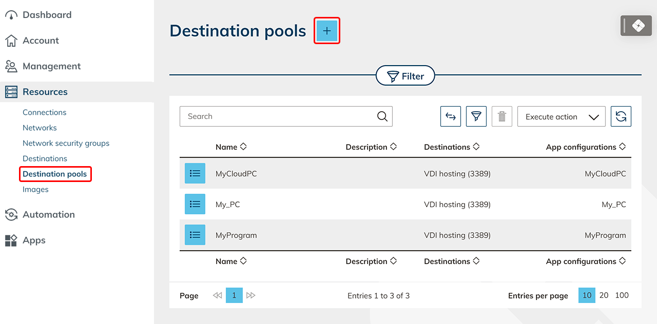 - Open Resources in the oneclick™ menu, select Destination pools, and click the Plus icon.