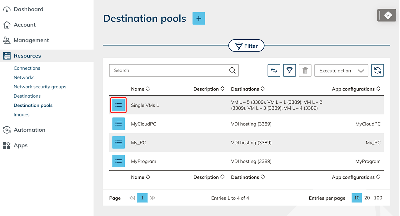 - Click the List icon to open the detail view of the desired Destination pool.
