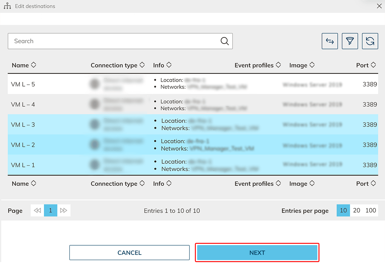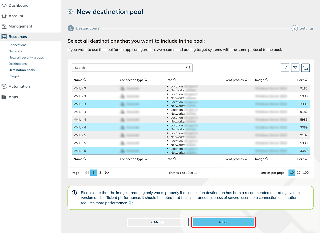 - Select the destinations from the list that you want to add to the Destination pool and click Next. :::note Port and protocol configuration