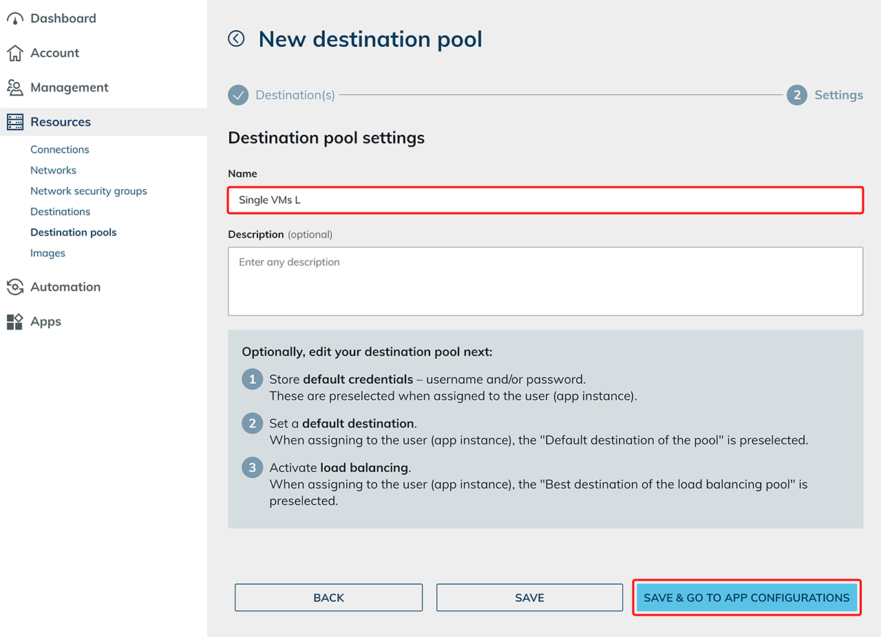 - Assign any Name to the new destination pool and Save your entries.